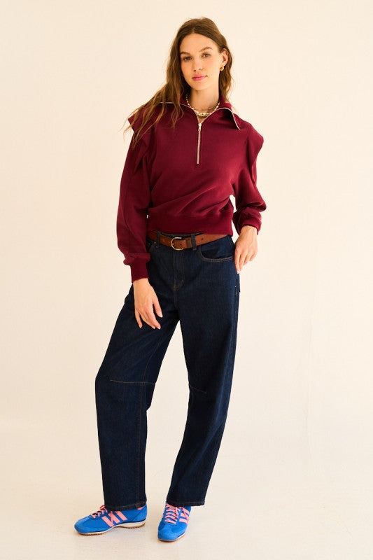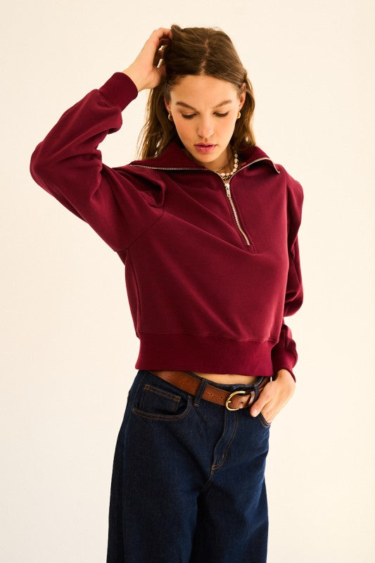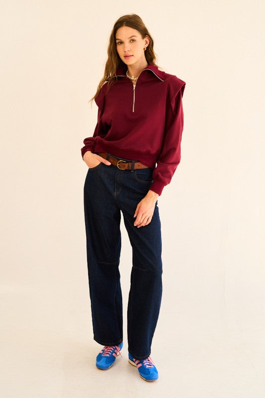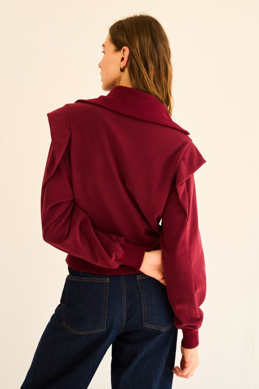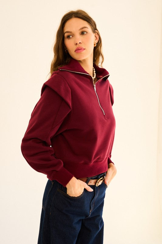 BURGUNDY HALF ZIP FRONT ZIP UP RUFFLED SWEATSHIRT