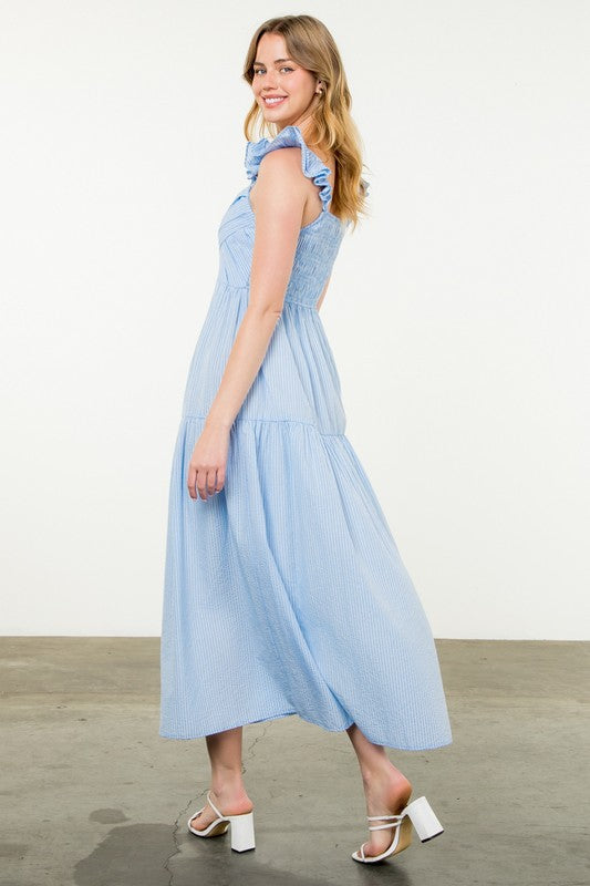 BLUE WHITE FLUTTER SLEEVE STRIPED DRESS. TIERED POPLIN MAXI DRESS.