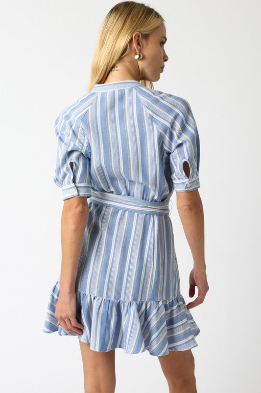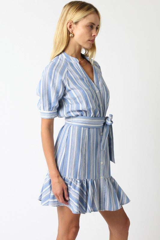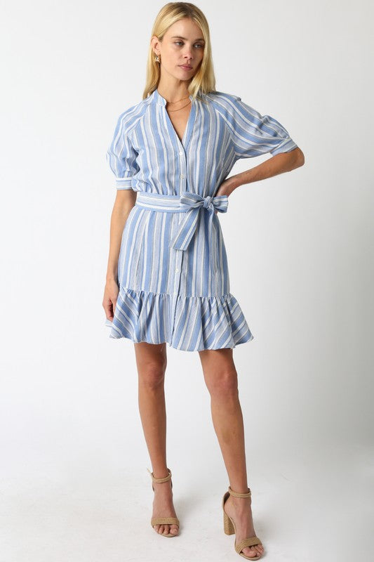 Our Cara Stripe Dress features an adjustable strap belt and a ruffled hem.