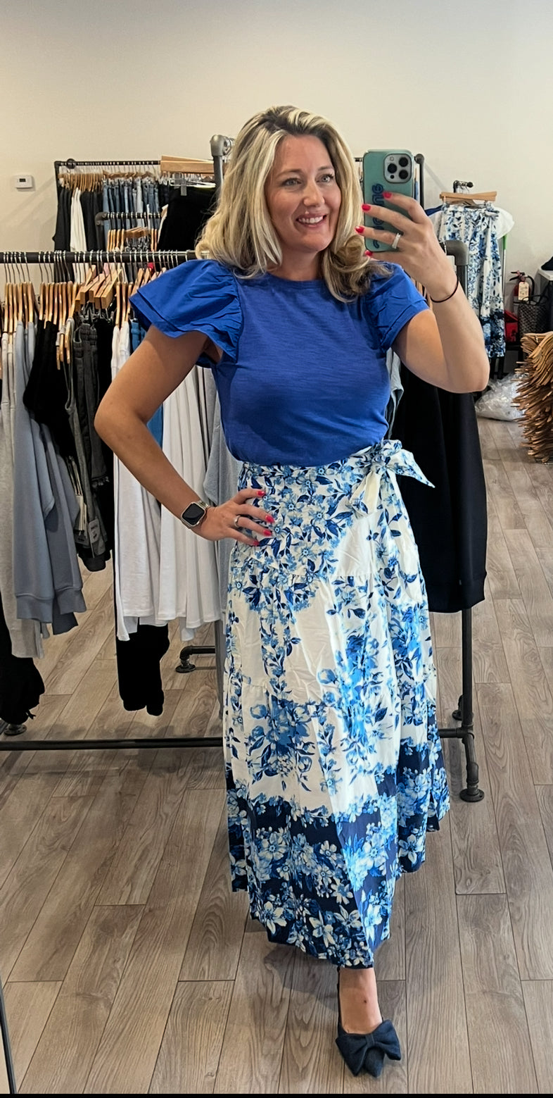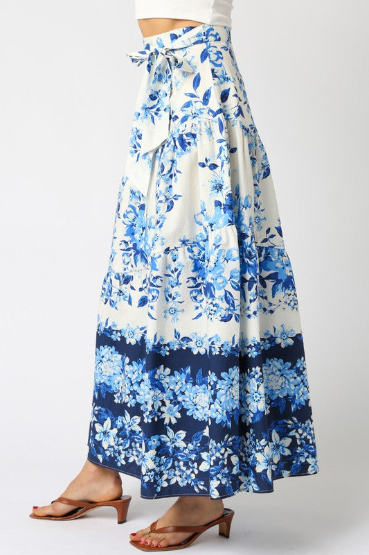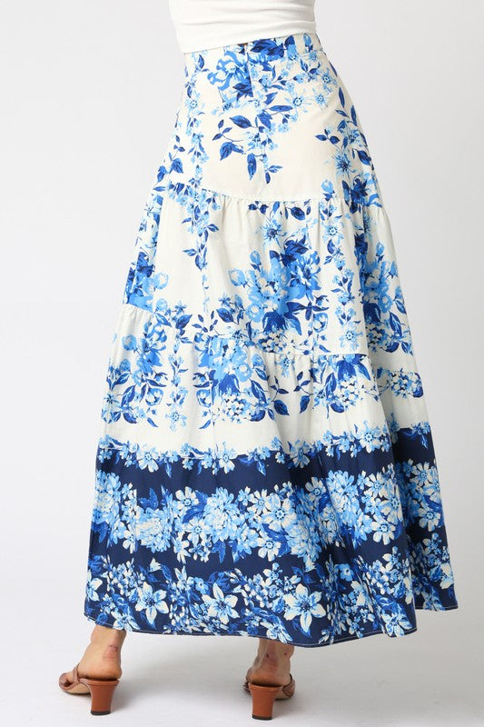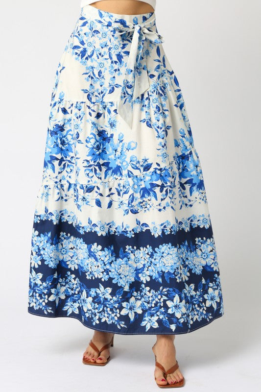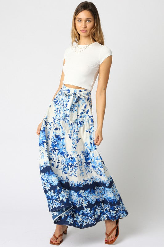 OLIVACEOUS FIONA BLUE WHITE FLORAL MAXI SKIRT