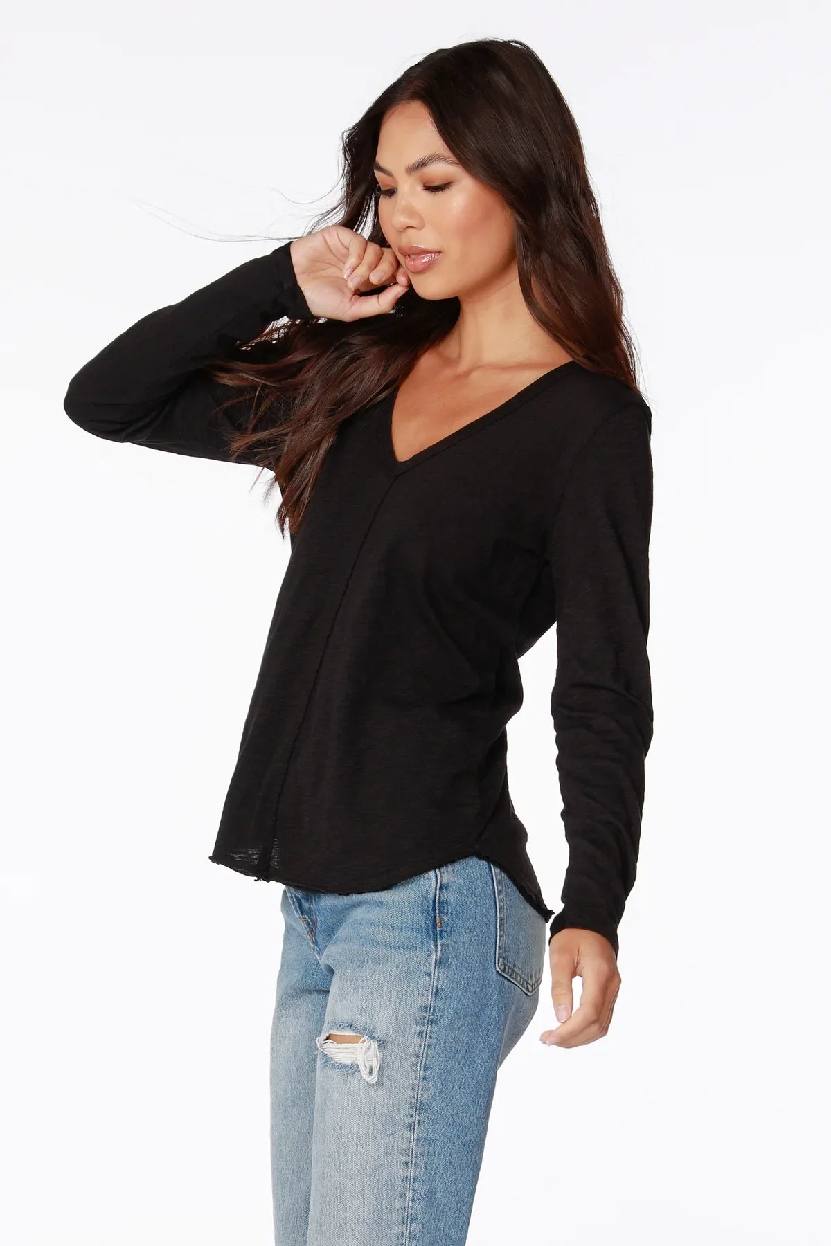 The classic long sleeve V-neck has been upgraded! This top has raw edge details, a center seam detail, and a curved hi-low hem. Perfect for tucking, layering, or just throwing it on. The style is in the details!