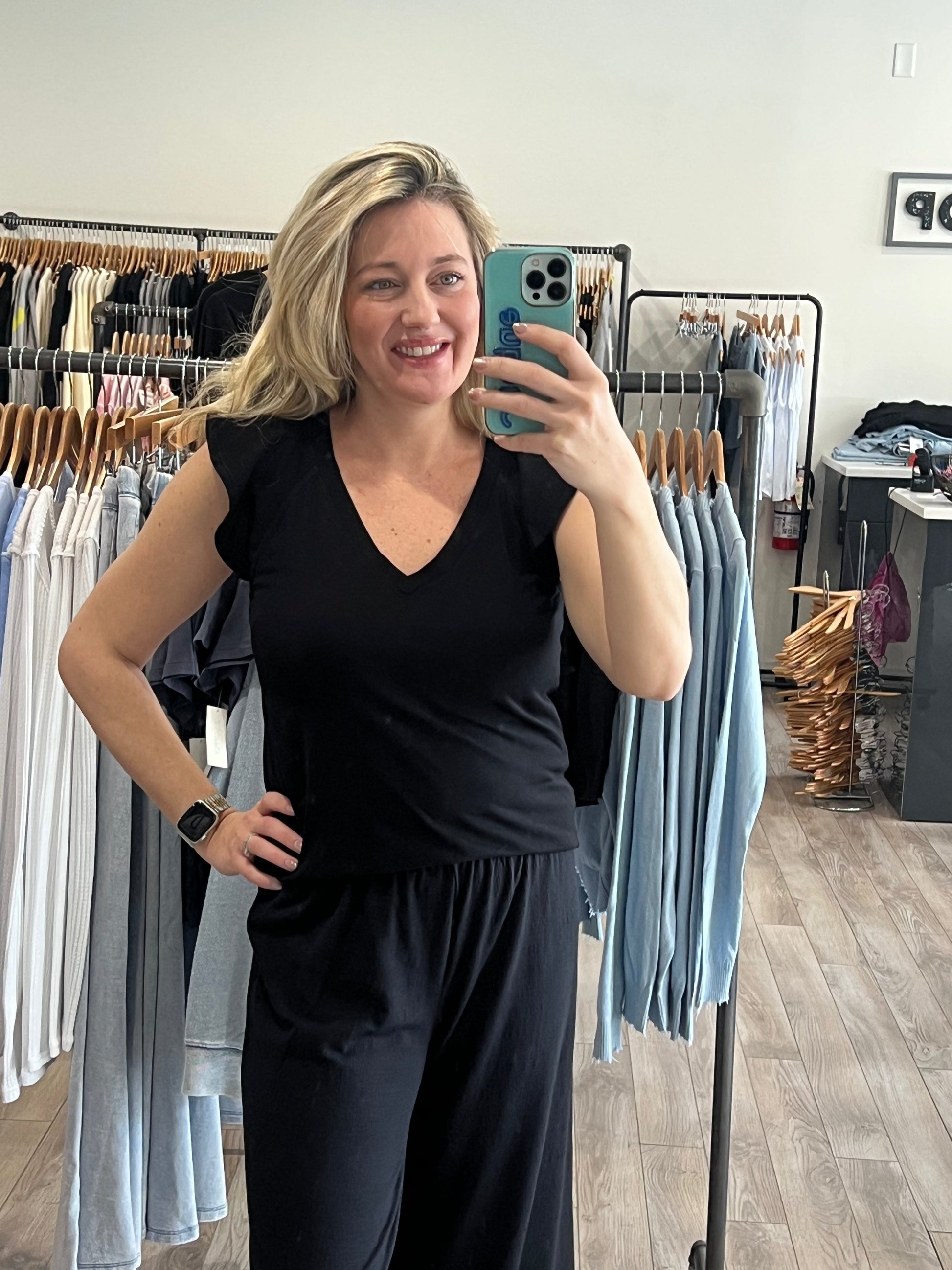 BOBI FLUTTER SLEEVE V NECK RAGLAN TEE BLACK
