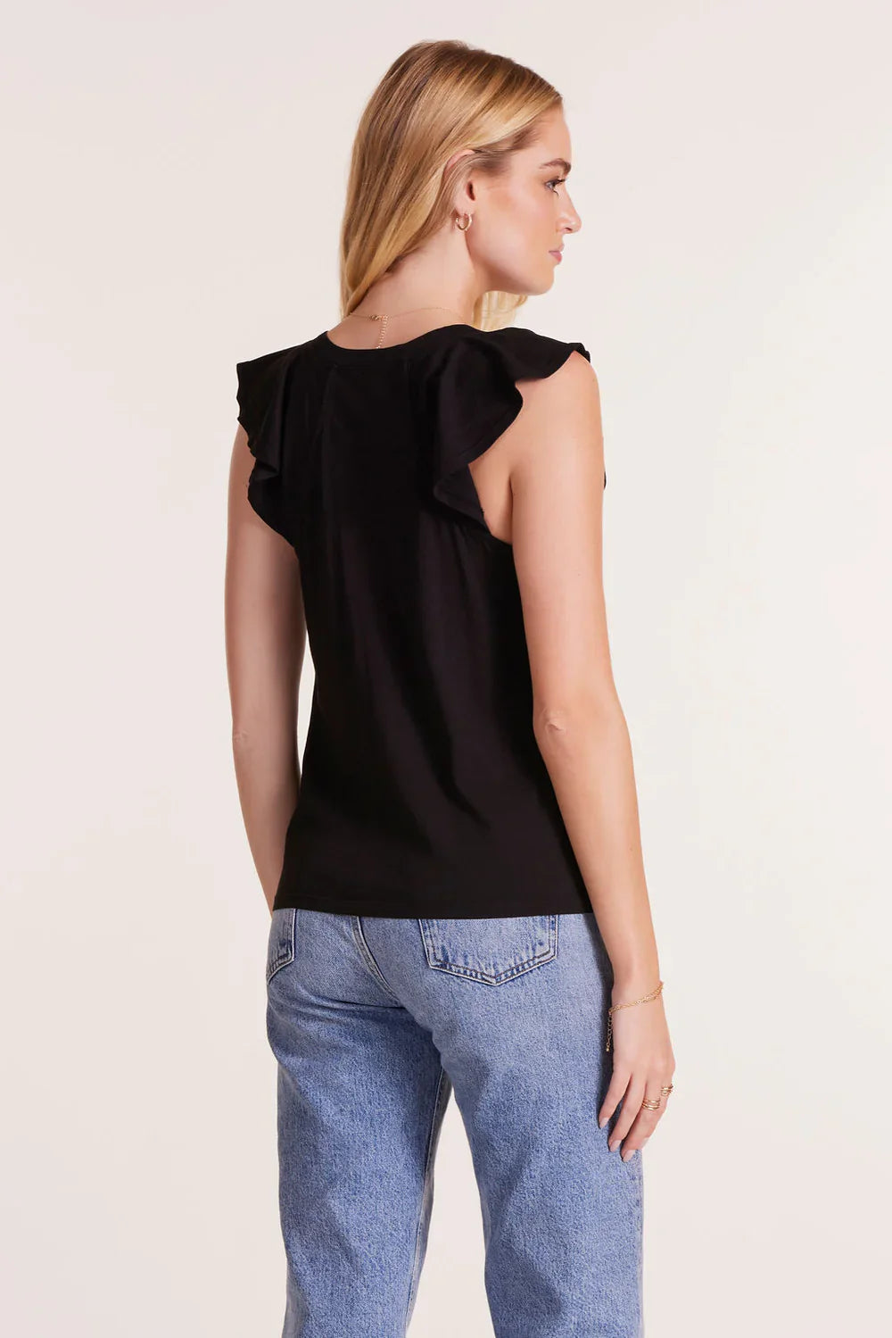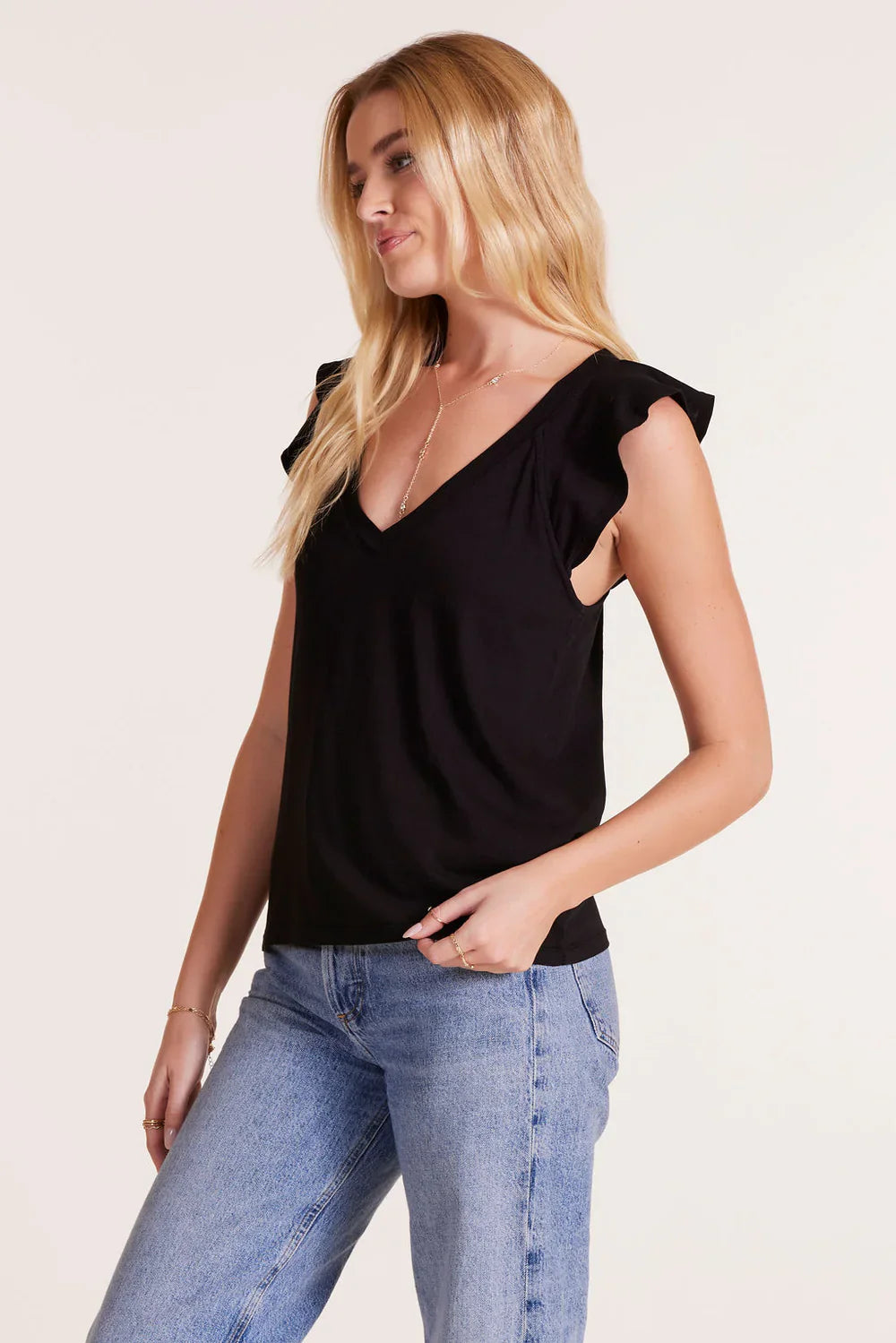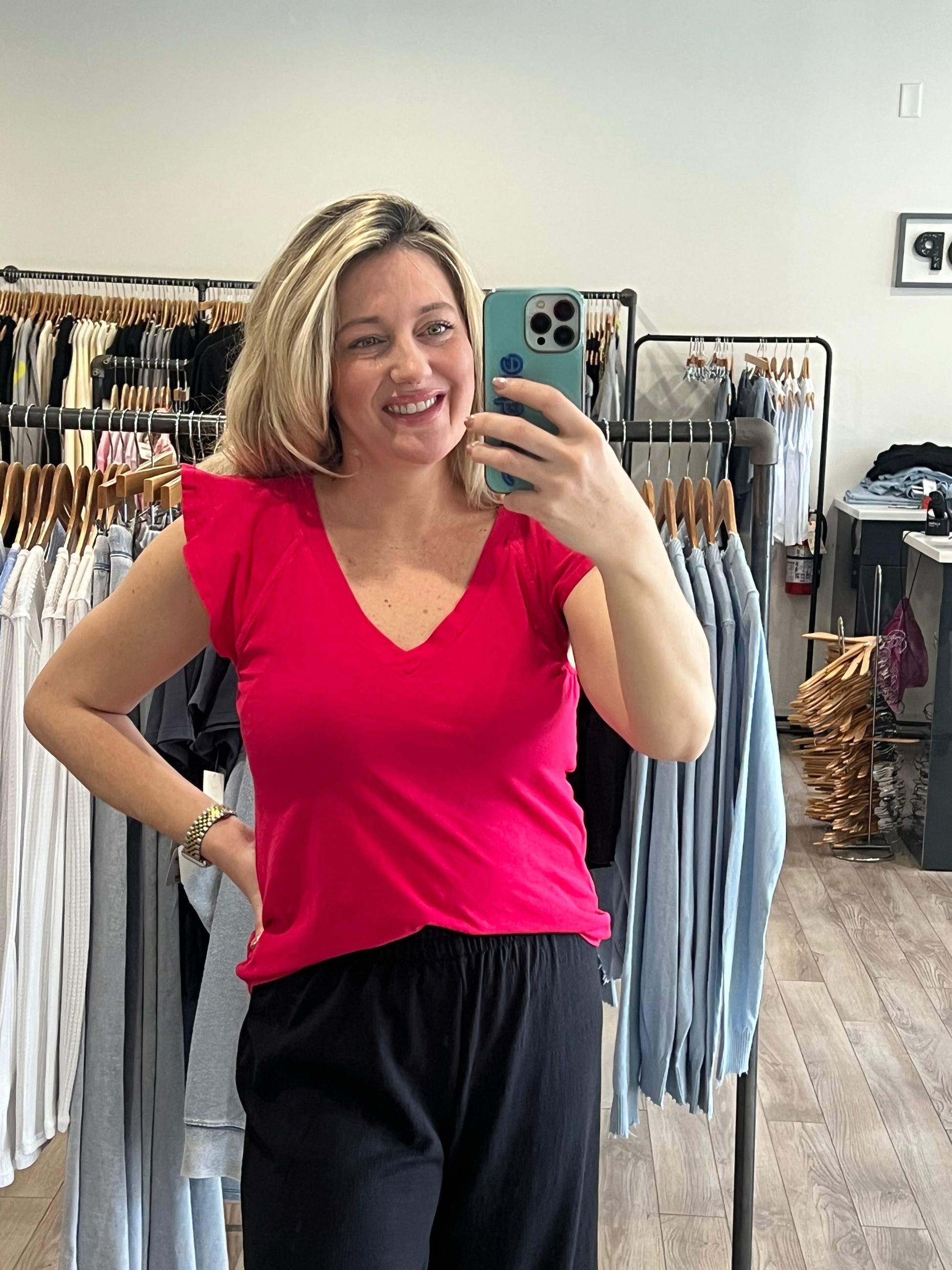 This flutter sleeve style is an ultra-romantic take on the v-neck tee. Make a style statement with this upgraded basic. Crafted from light weight 100% cotton, this top is both luxuriously soft and ready to layer.
