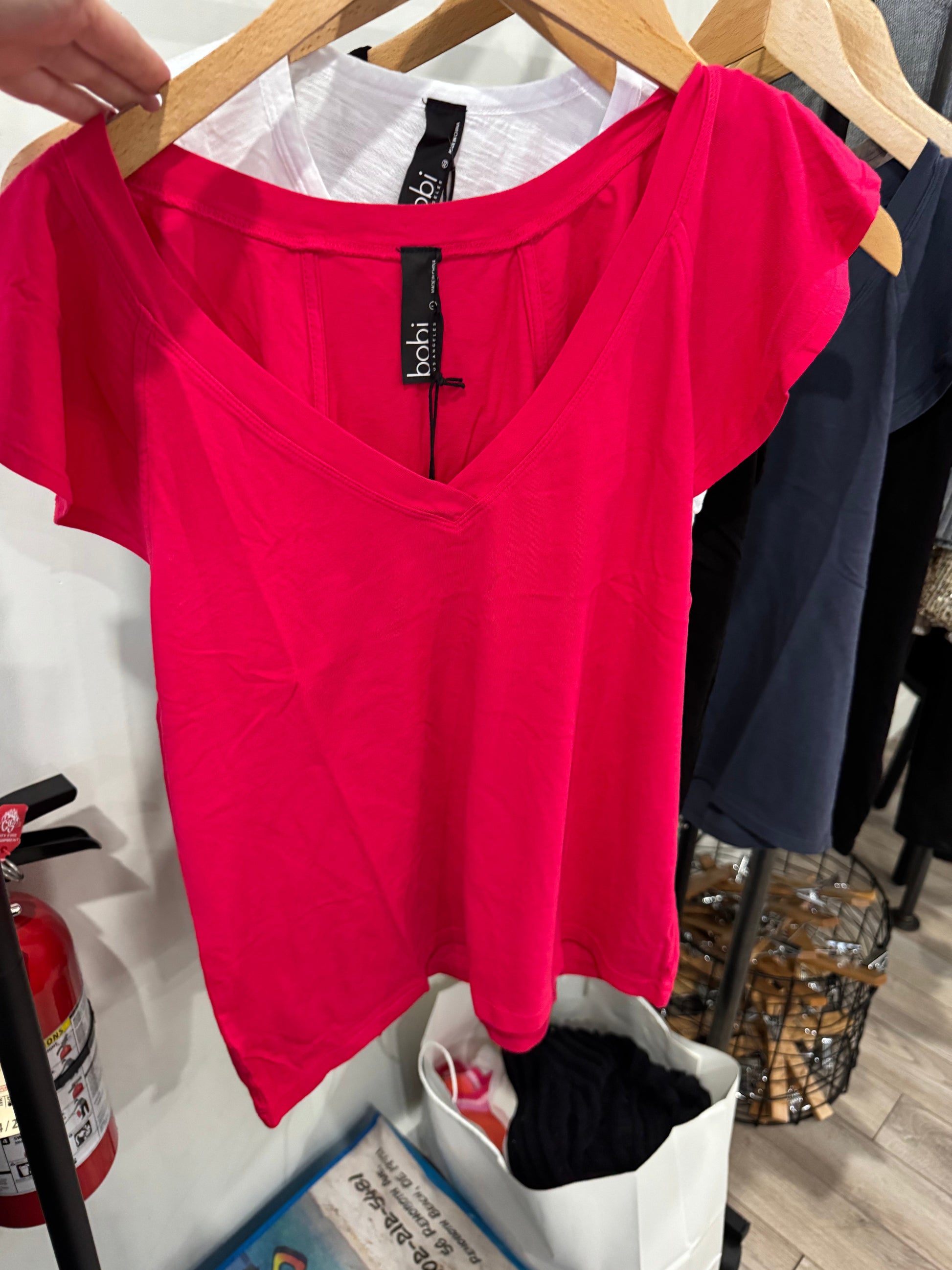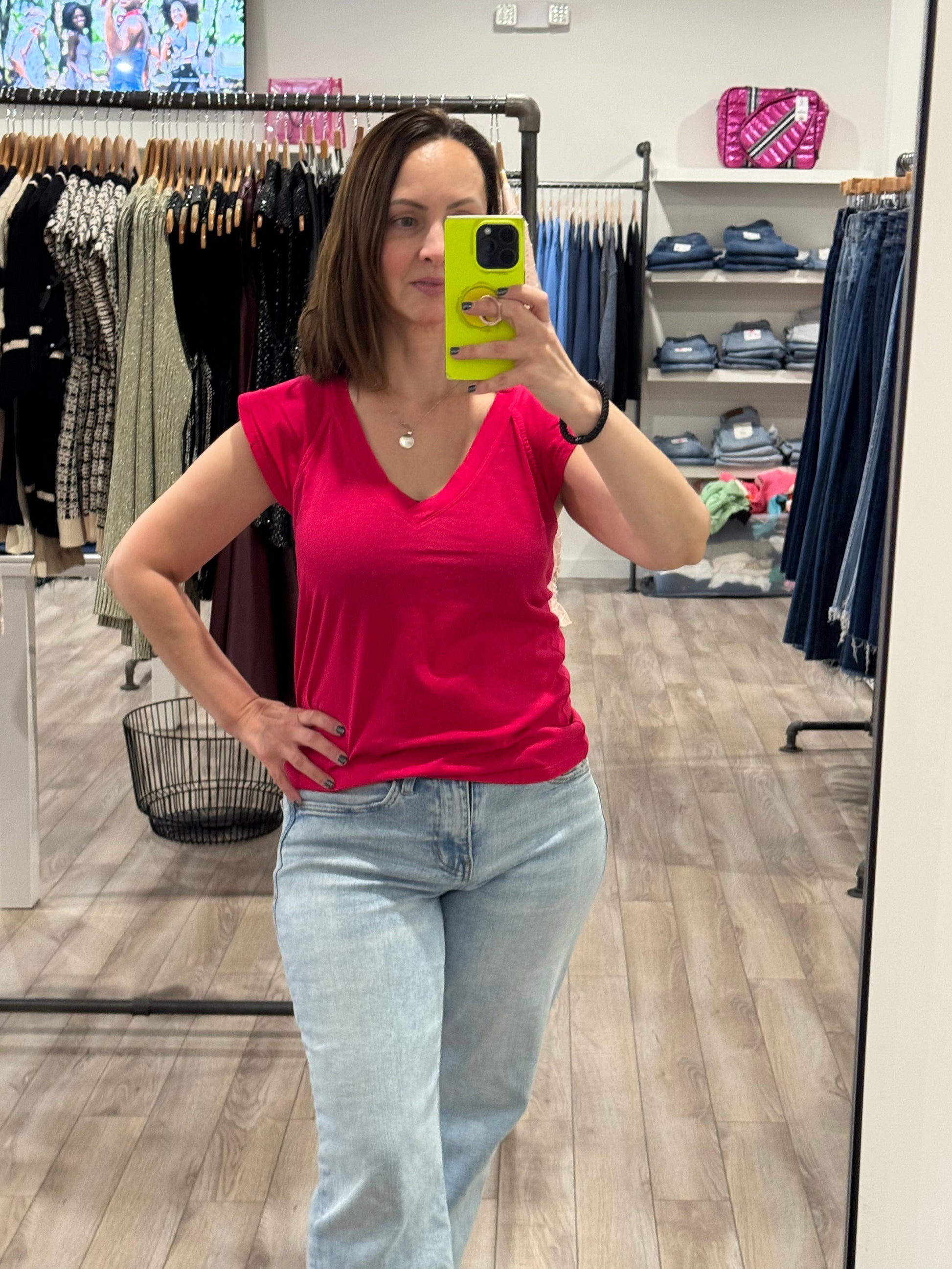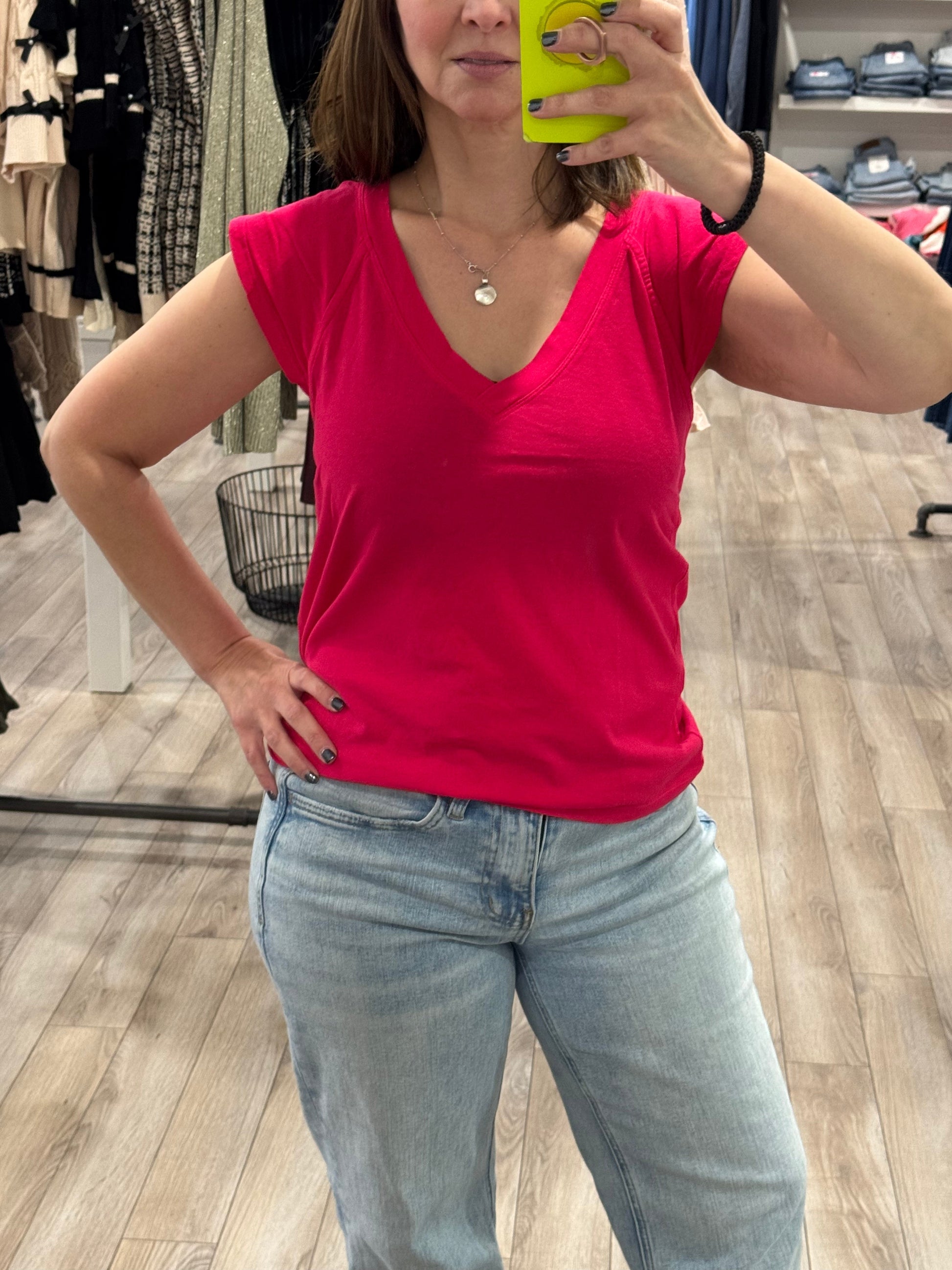 BOBI FLUTTER SLEEVE V NECK RAGLAN TEE RUBY PINK