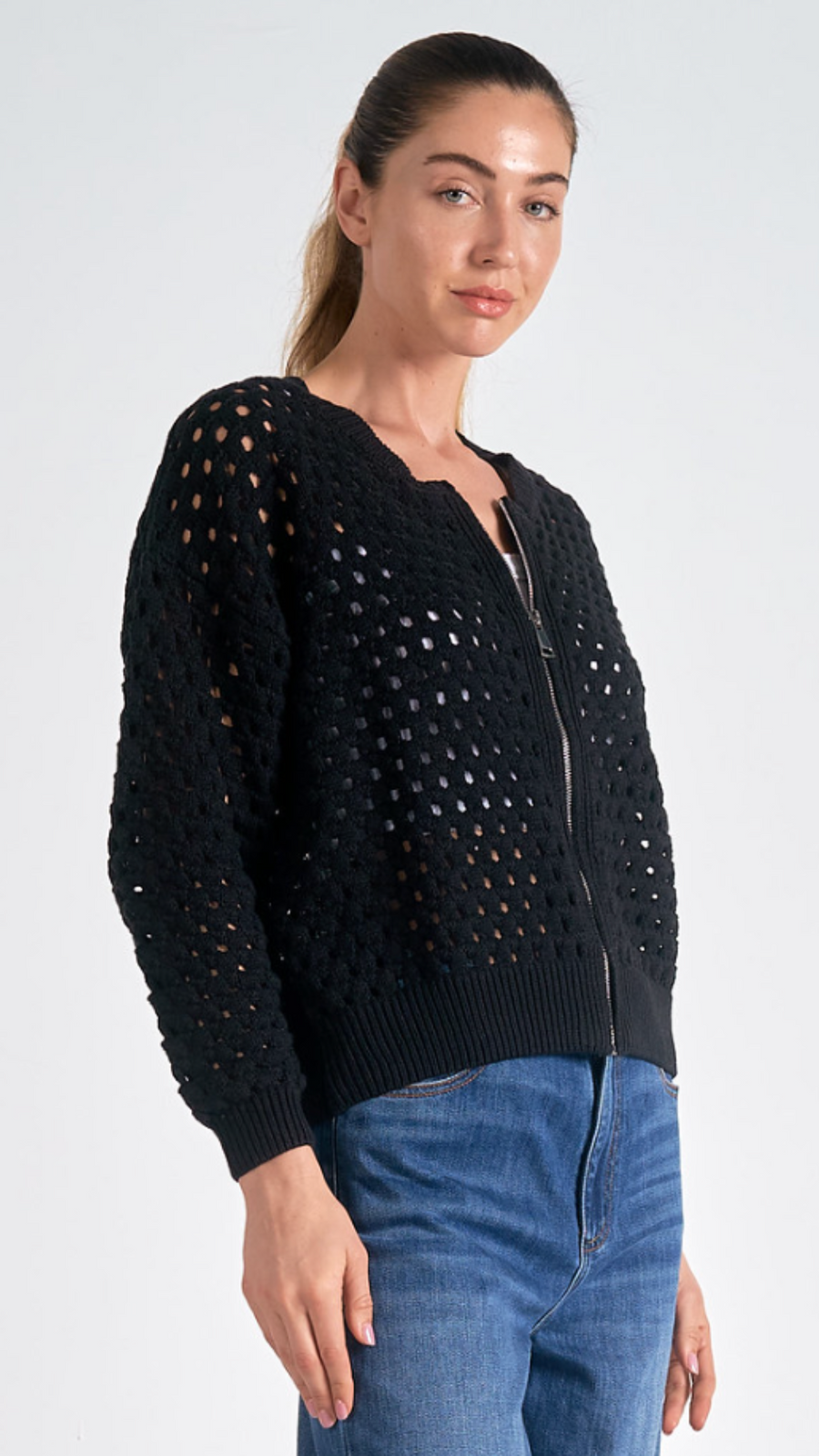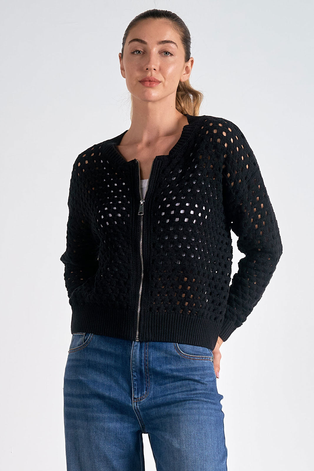 ELAN BLACK OPEN KNIT ZIP CARDIGAN SWEATER