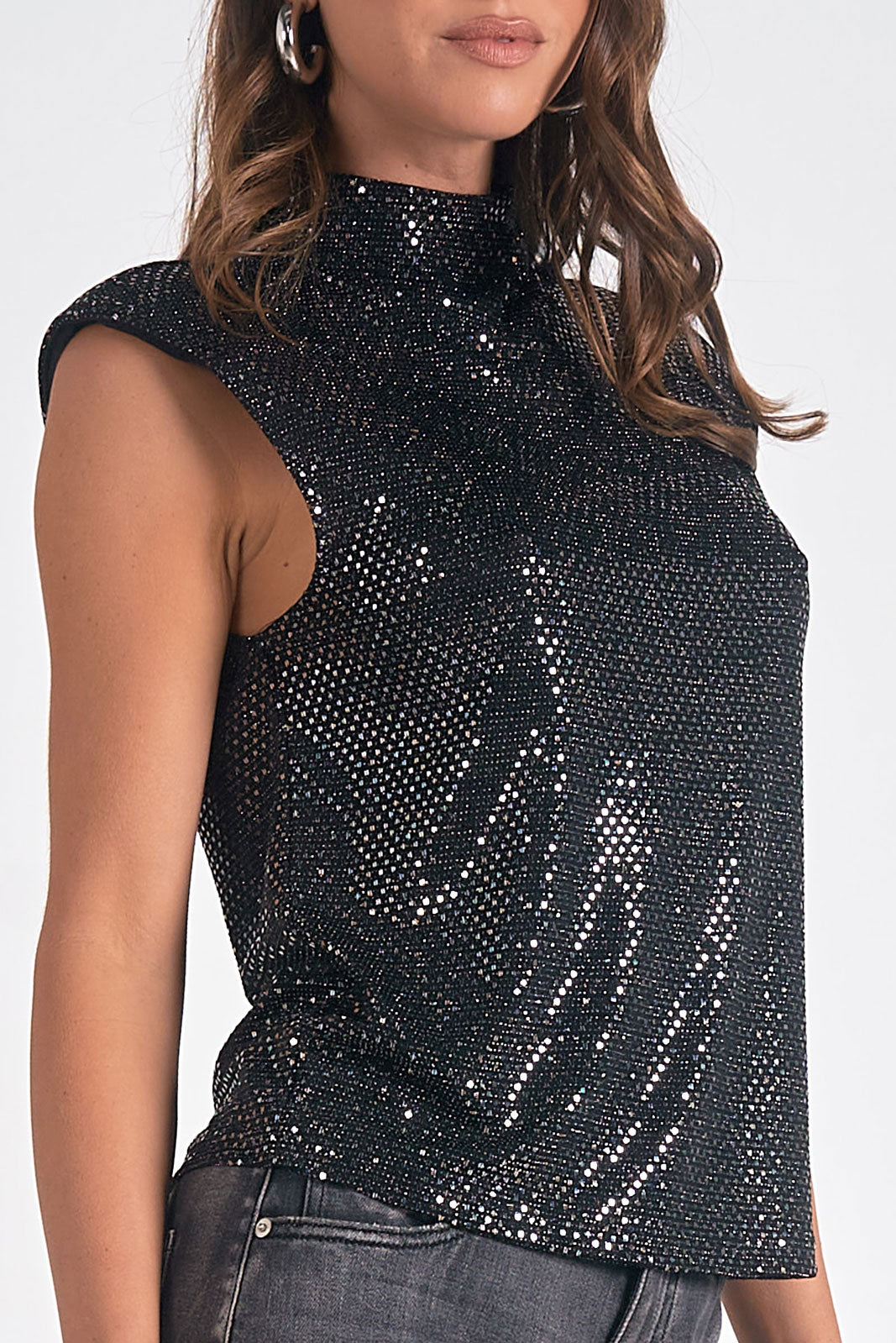 BLACK SHIMMER SEQUIN MOCK NECK CAP SLEEVE TOP