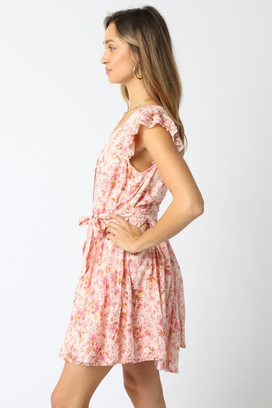 Our Ellis Floral Dress features an adjustable strap and a ruffled hem. Front buttons.