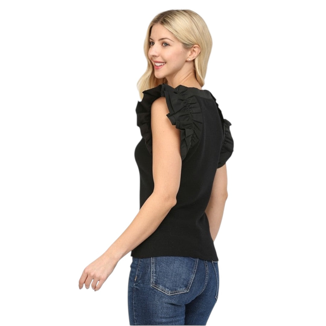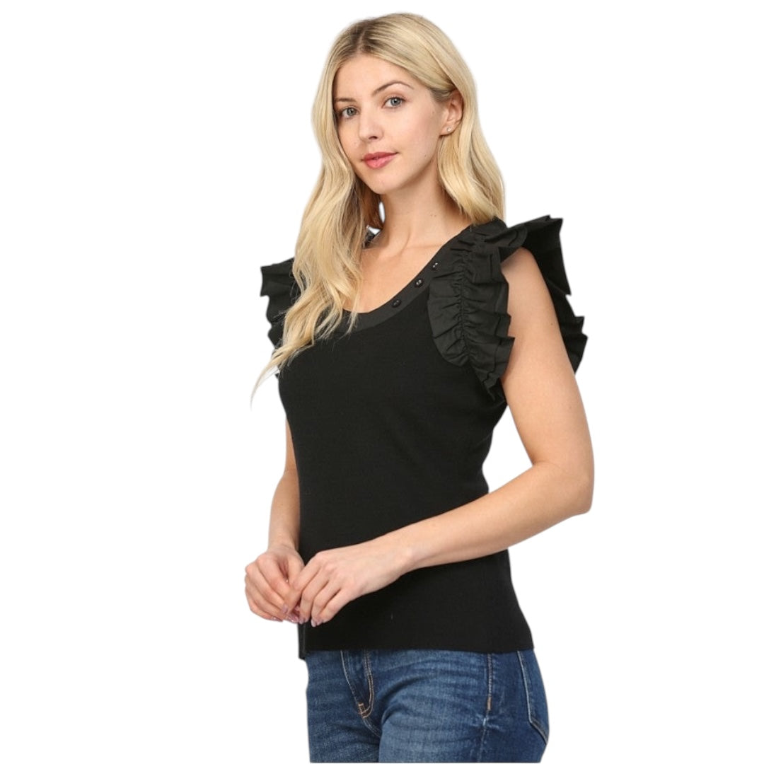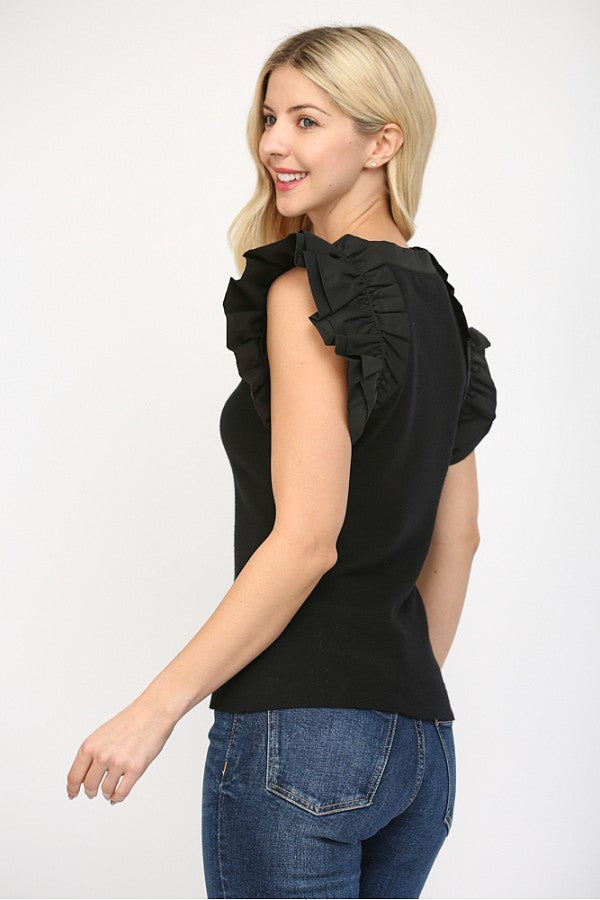 RUFFLED SLEEVELESS DEEP NECK LINE FITTED SWEATER TOP WITH BUTTON DETAIL