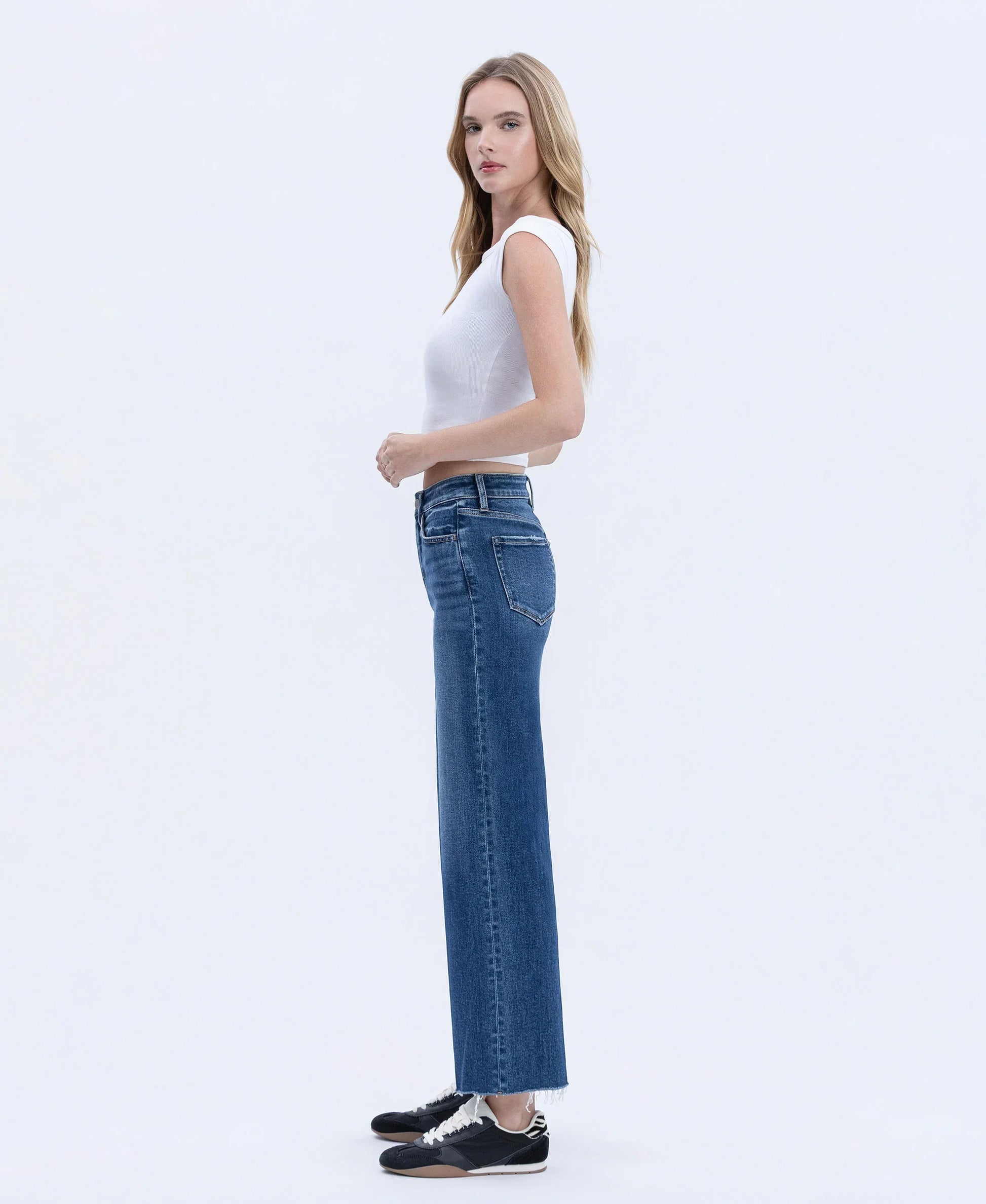 HIGH RISE TROUSER PRESS WIDE LEG JEANS. COMFORT STRETCH DENIM, RAW HEM, ANKLE LENGTH.