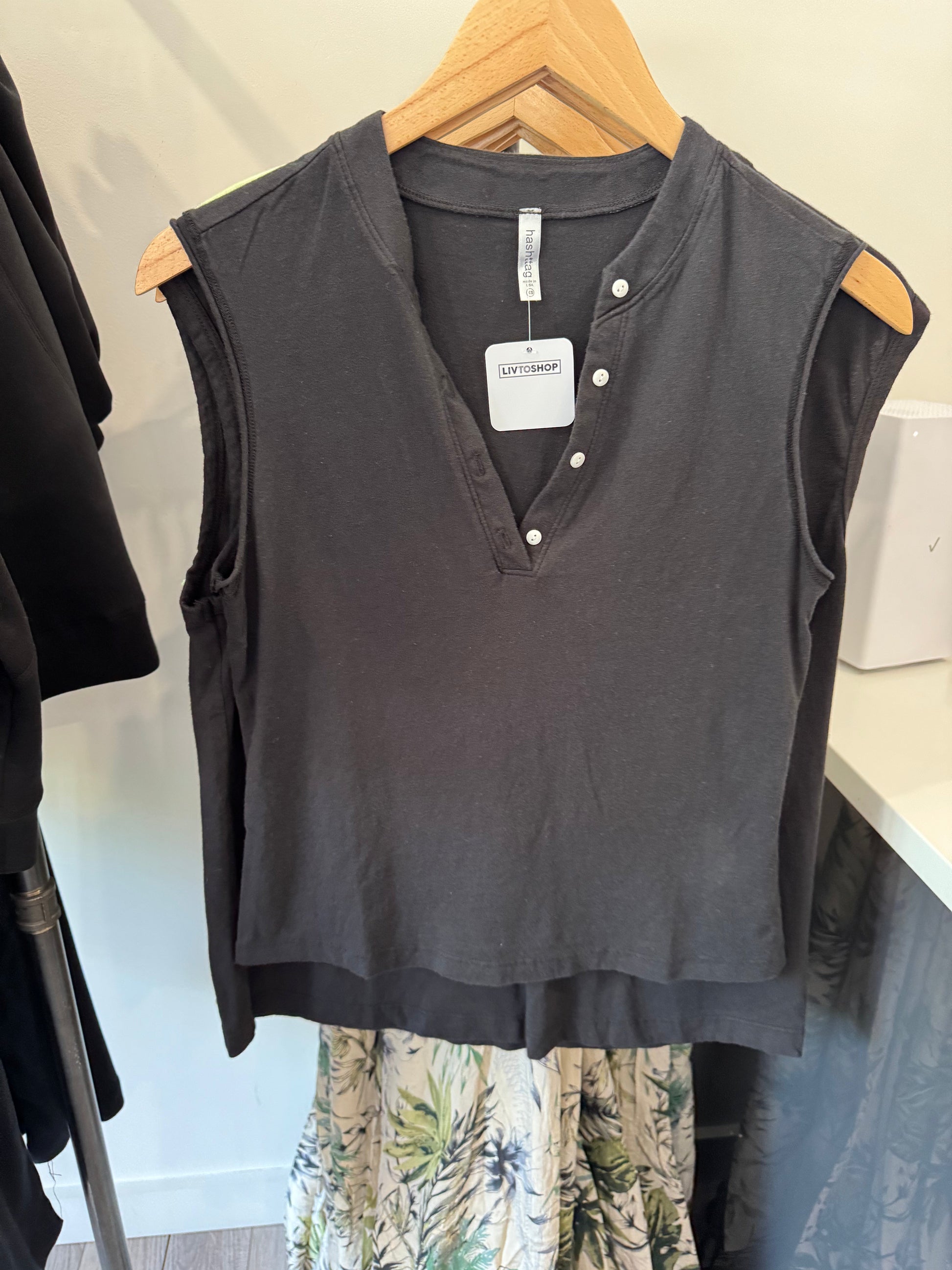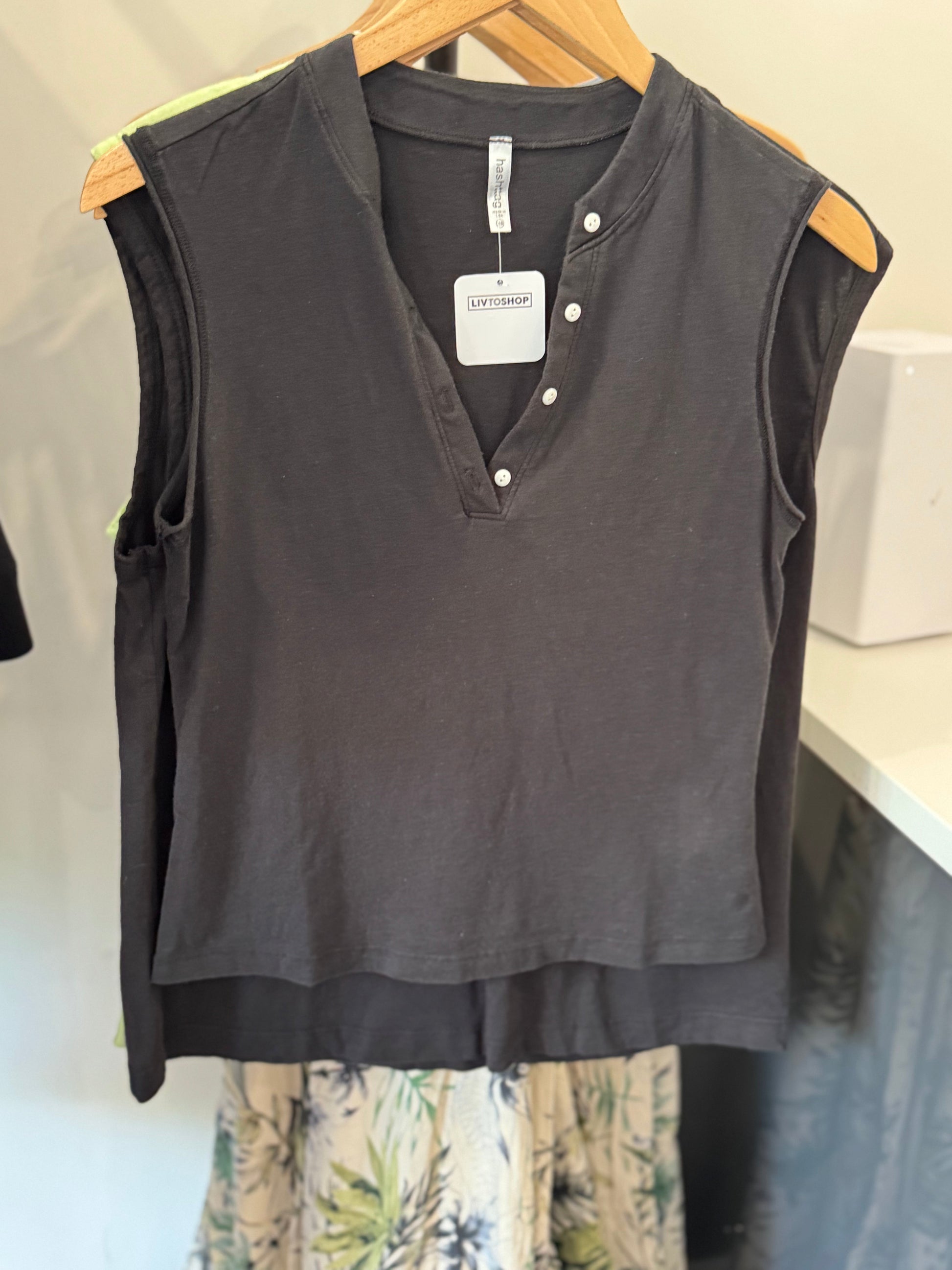HASHTTAG GARMENT DYE SLEEVELESS HENLEY TOP BLACK