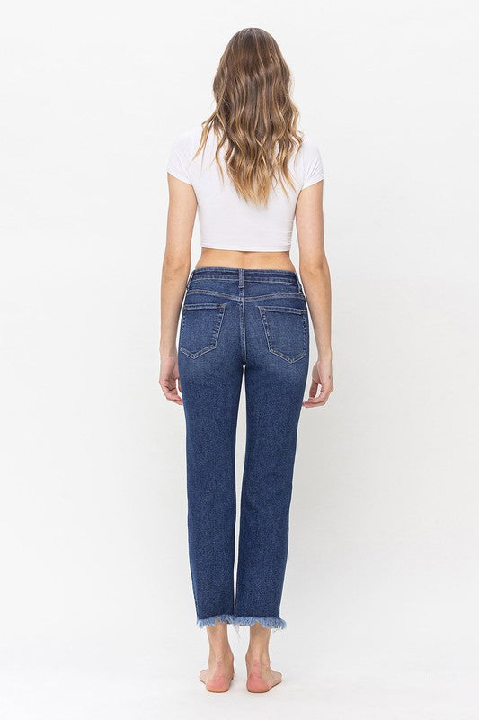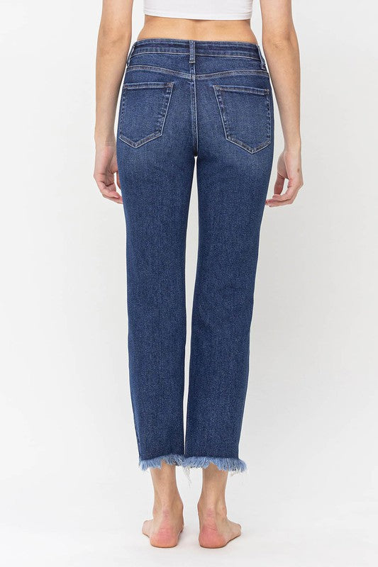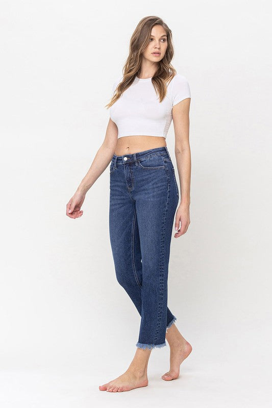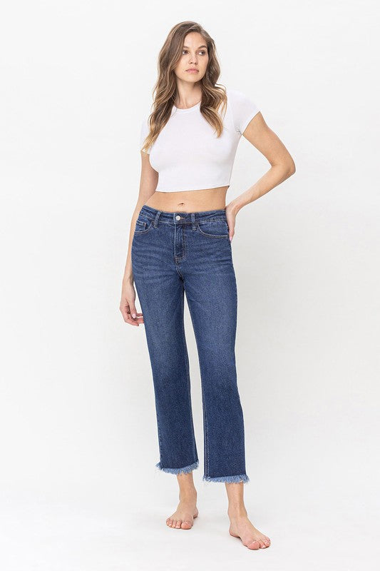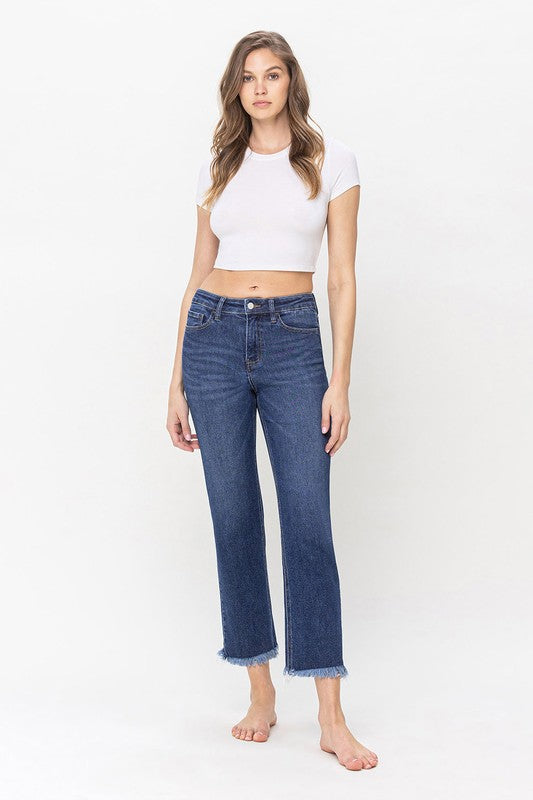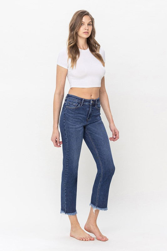 HIGH RISE CROP STRAIGHT, DISTRESSED DETAIL, CROP SLIM STRAIGHT, FRAYED HEMLINE. COMFORT STRETCH.