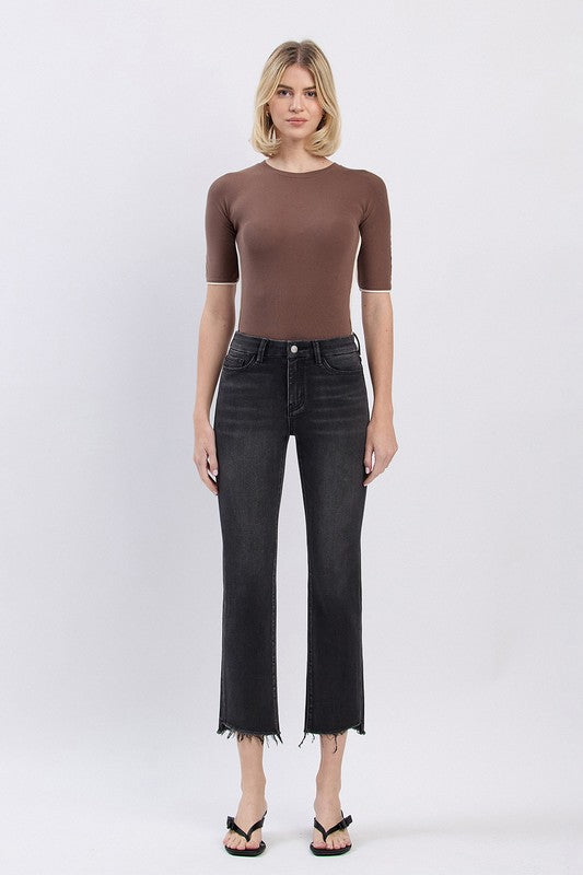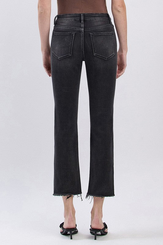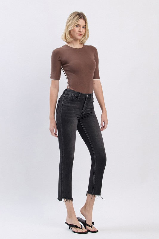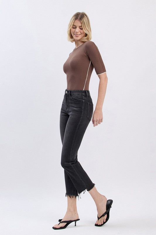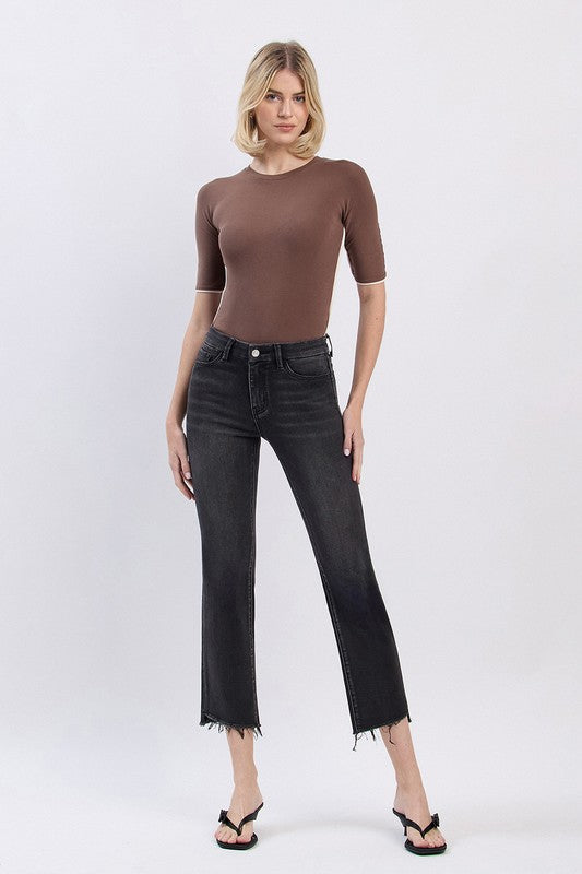 HIGH RISE FRAYED HEM SLIM STRAIGHT JEANS COMFORT STRETCH DENIM. FRAYED HEM, CROPPED LENGTH.