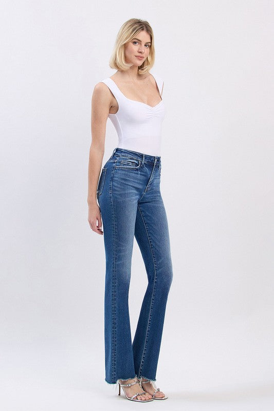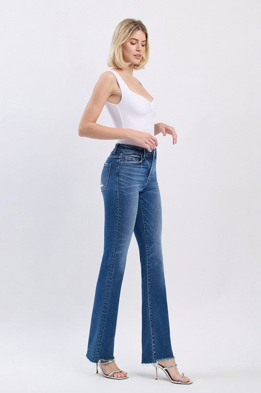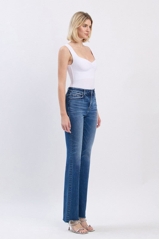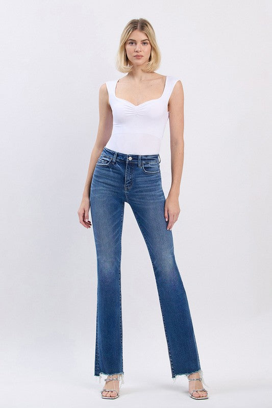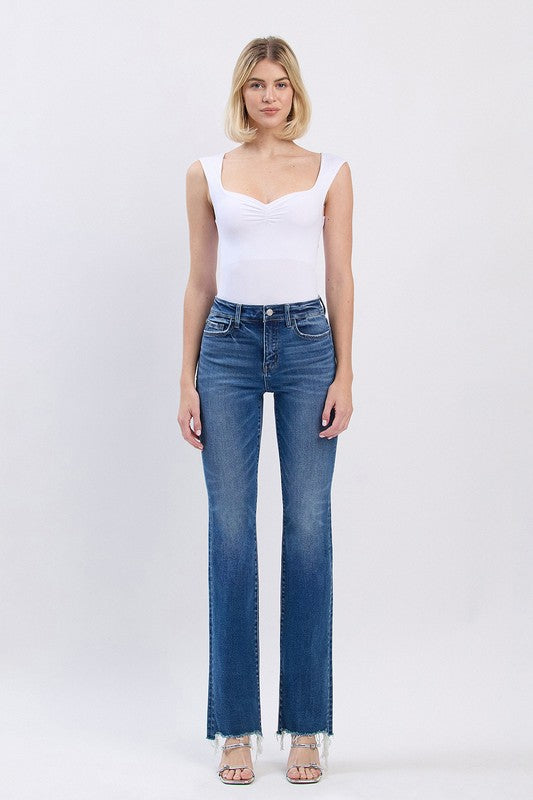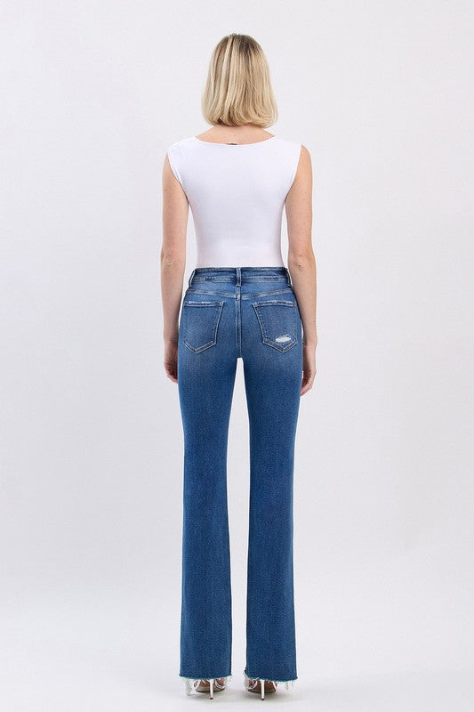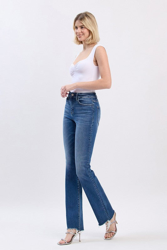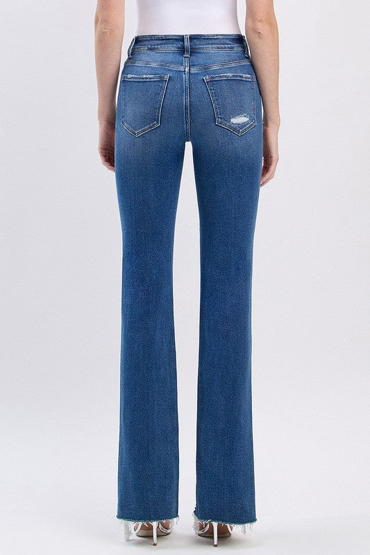 HIGH RISE BOOTCUT JEANS COMFORT STRETCH DENIM, DISTRESSED DETAIL, RAW HEM, FULL LENGTh