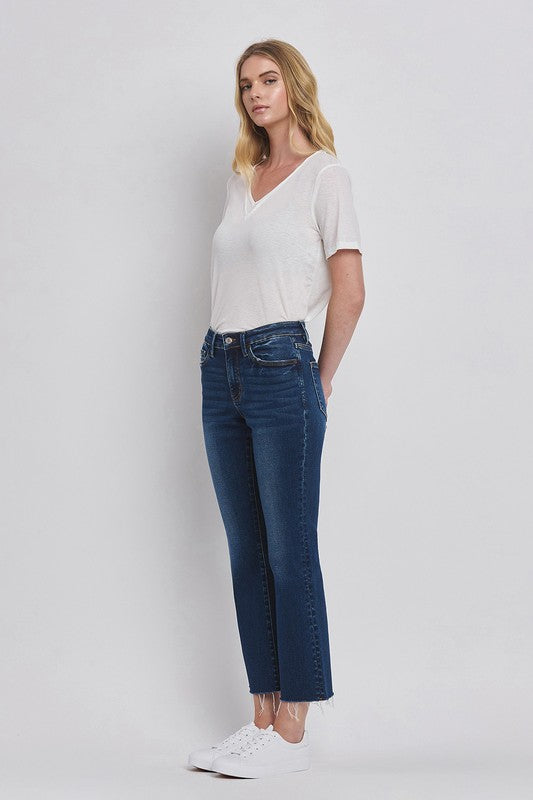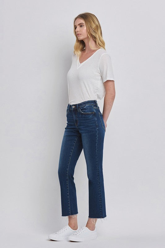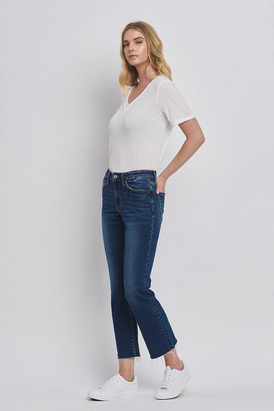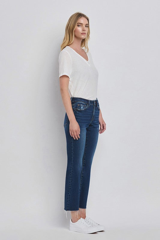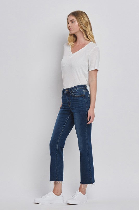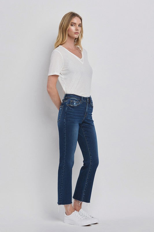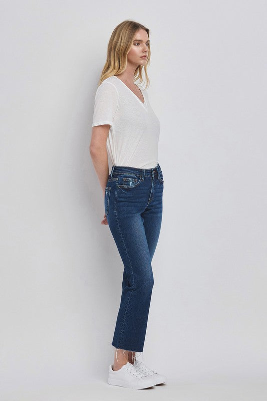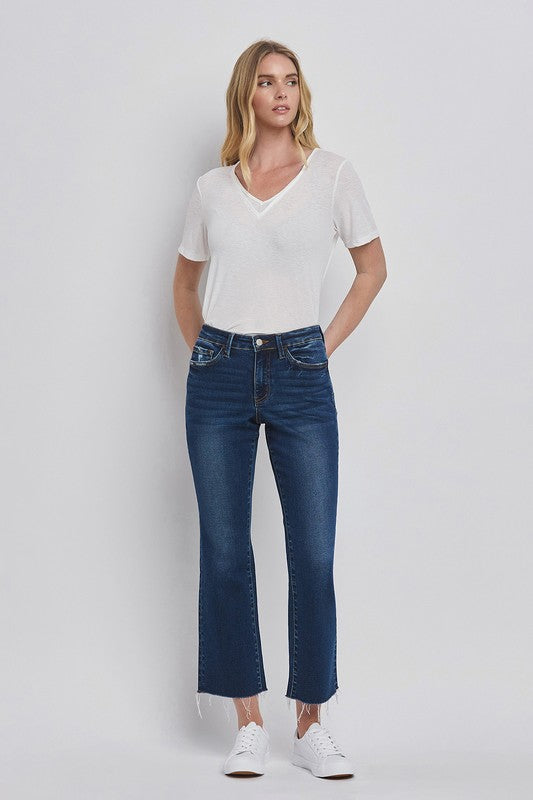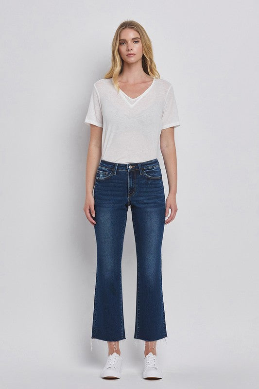 HIGH RISE MINI BOOTCUT JEANSCOMFORT STRETCH DENIM, HIGH RISE WAIST, SLIGHTLY DISTRESSED DETAIL, RAW HEM, ANKLE LENGTH, MINI BOOTCUT JEANSF. RISE: 10" / INSEAM: 28" / LEG OPENING: 16"MODEL IS 5'10" WEARING SIZE 26