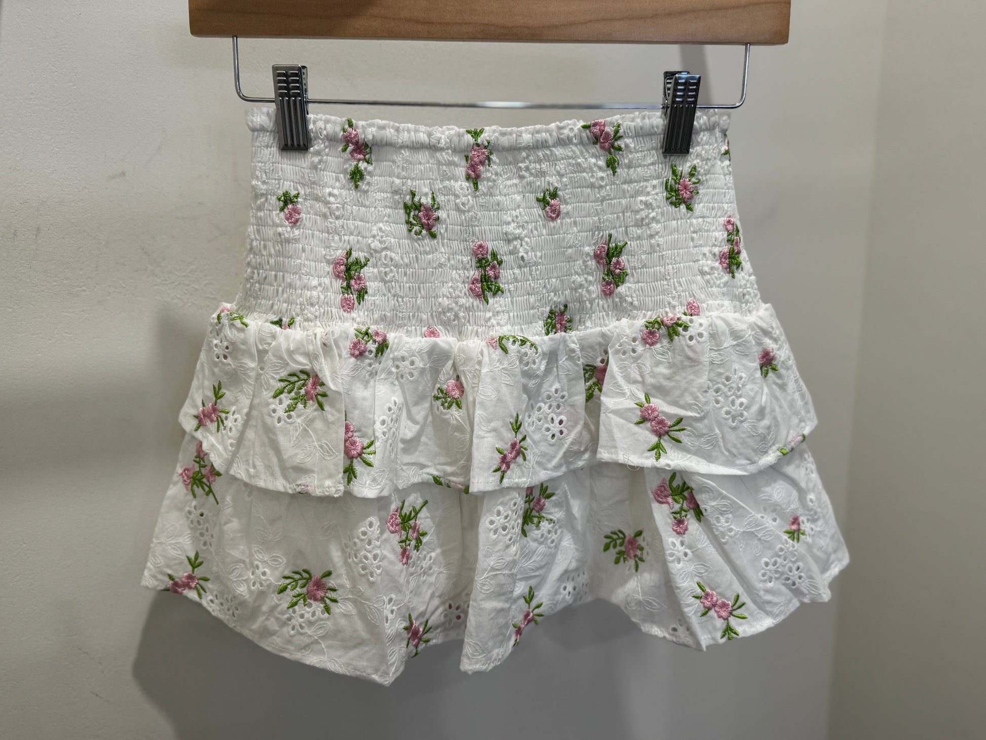 - WHITE PINK FLORAL SKIRTOur Kenna Floral Skirt features a ruffled hem and smoking detail FINAL SALE