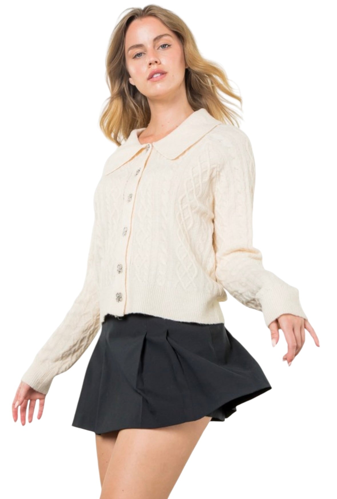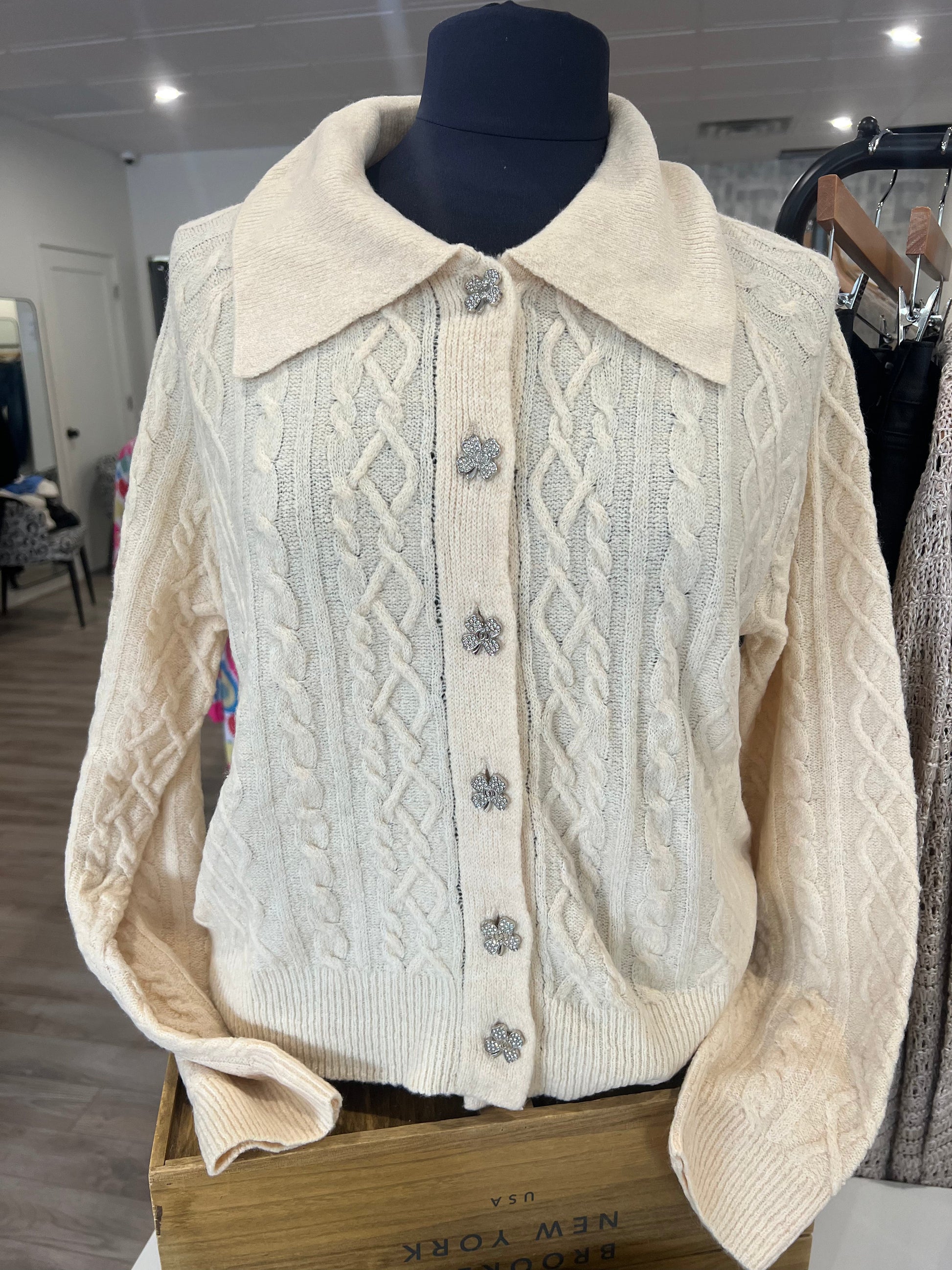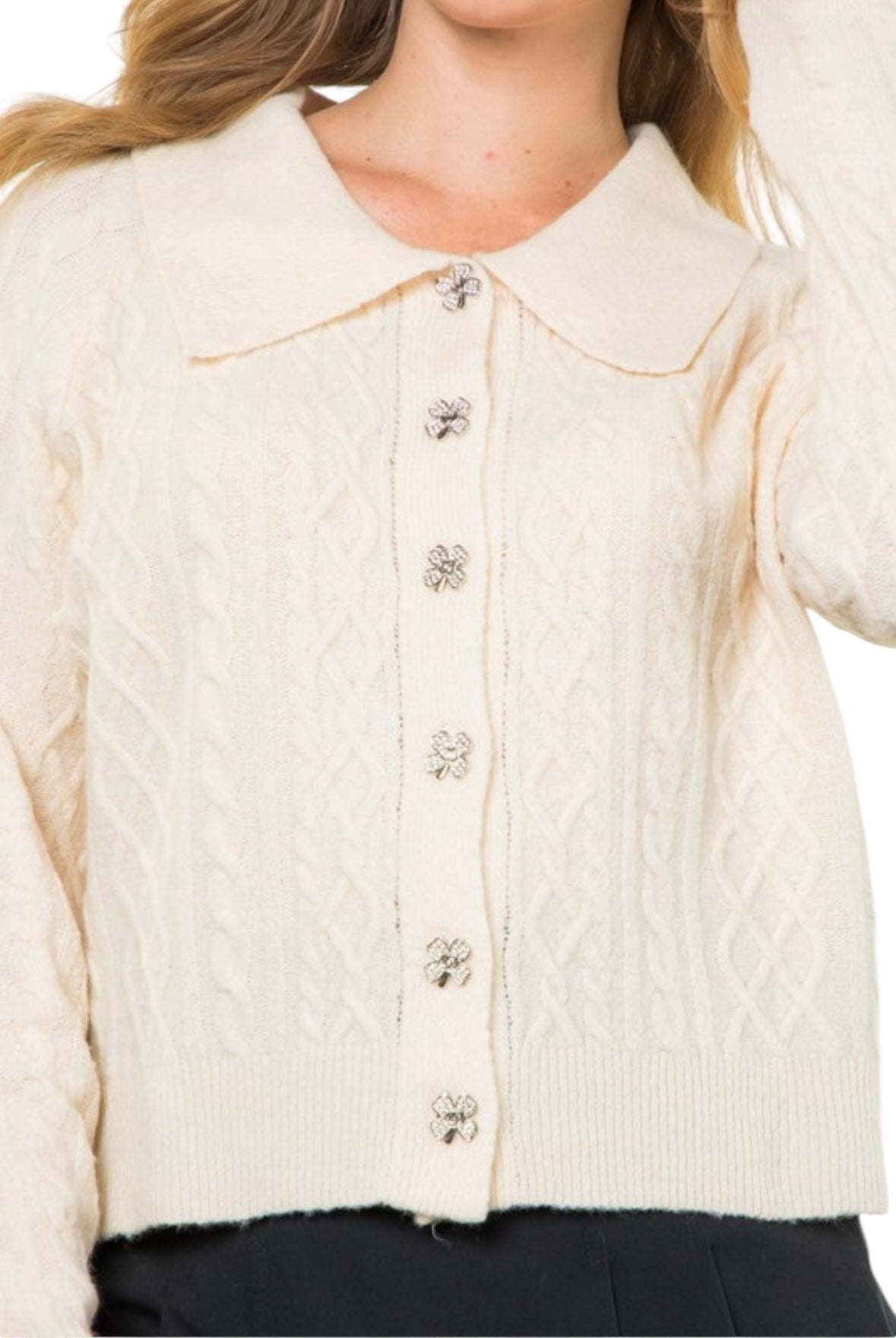 JEWELED BUTTON UP KNIT CARDIGAN WITH COLLAR