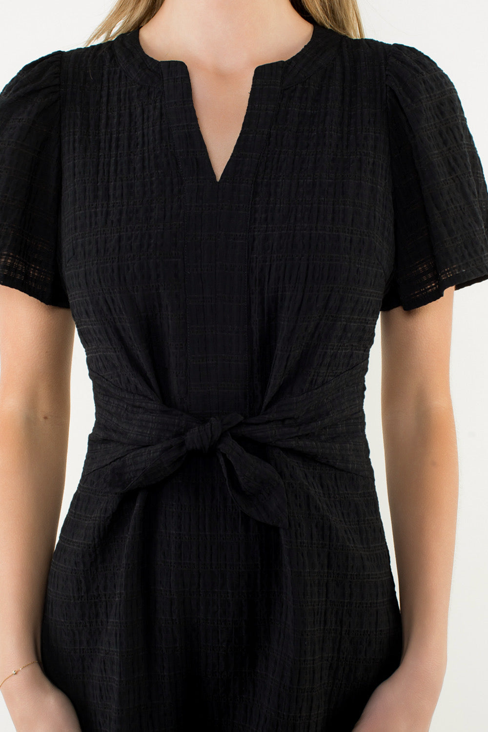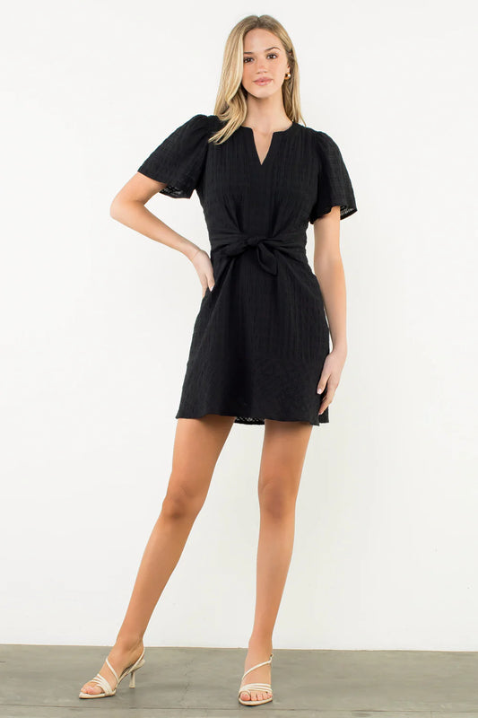 BLACK SHORT SLEEVE TEXTURED DRESS. FRONT TIE. MINI DRESS.