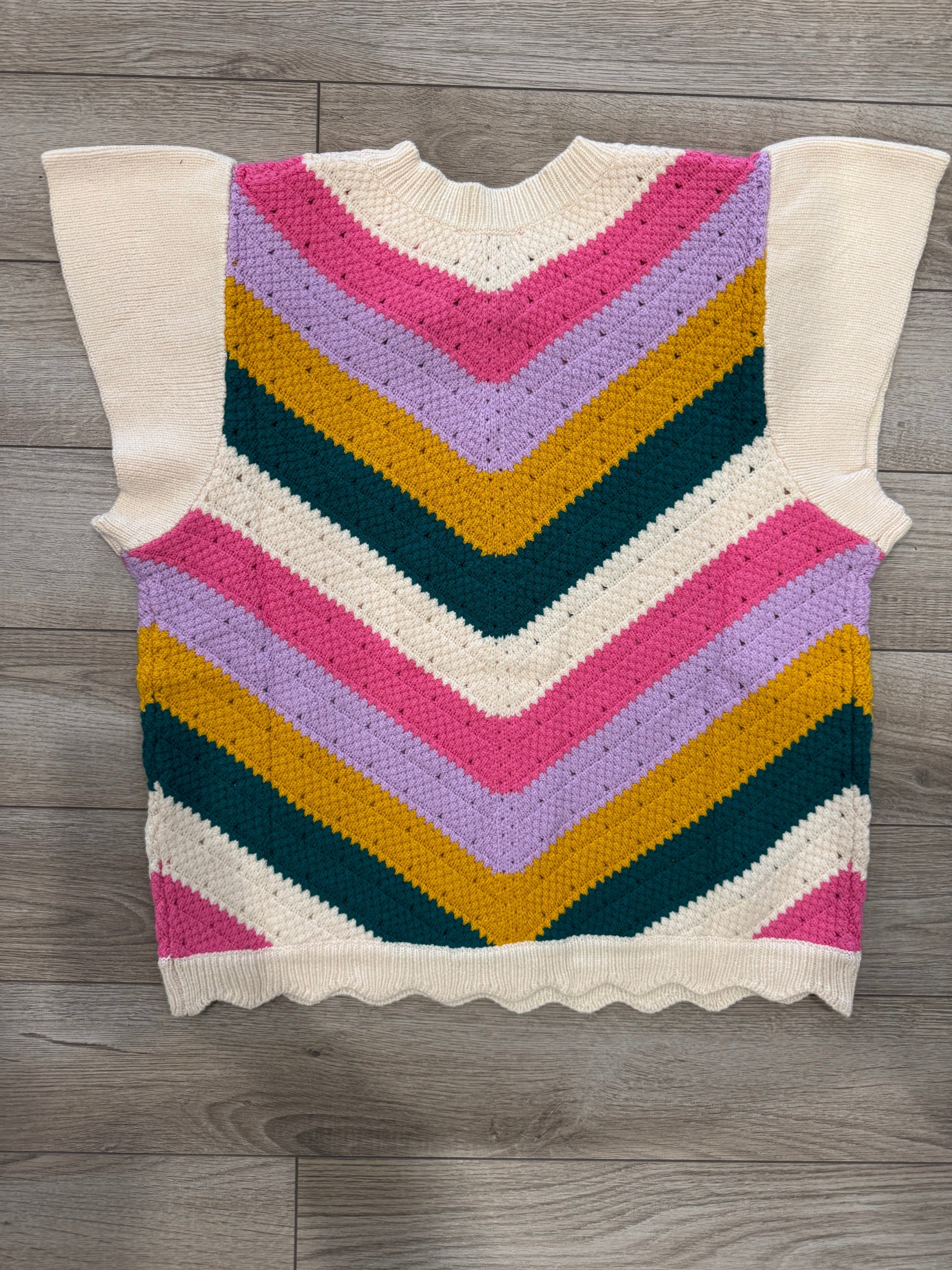 THML CREAM MULTI KNIT SHORT SLEEVE TOP