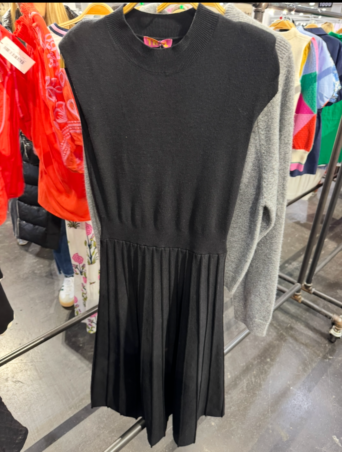 SOFT RIBBED KNIT, MOCK NECK, FITTED BODICE AND FLATTERING PLEATED SKIRT.