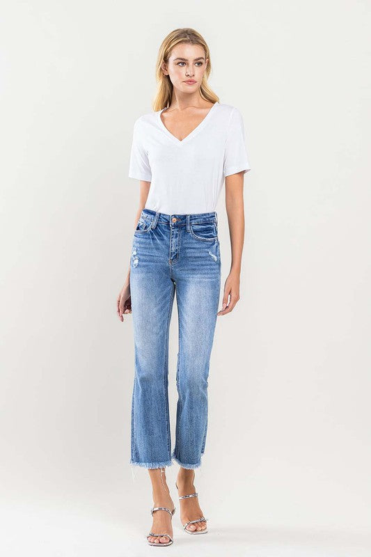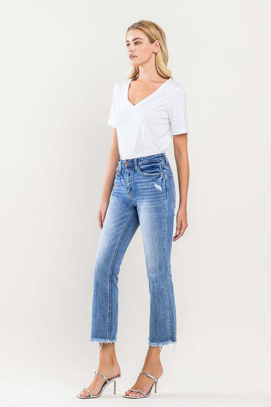 HIGH RISE KICK FLARE JEAN W FRAYED HEM. CROPPED.