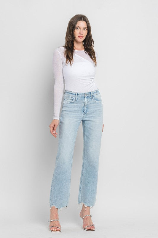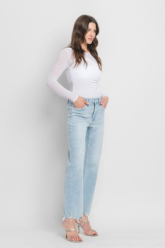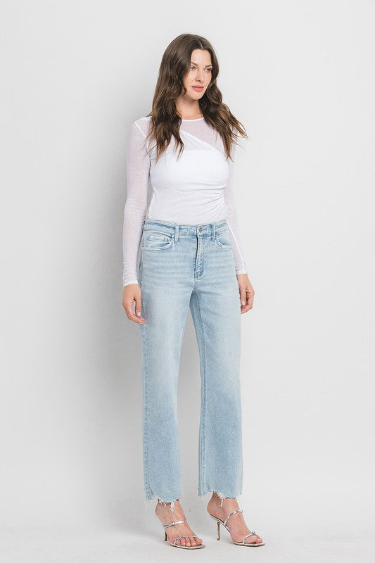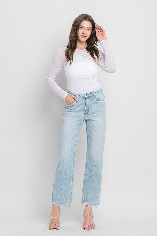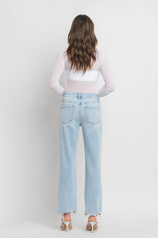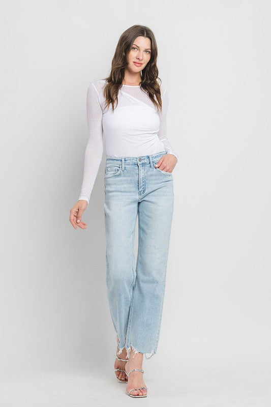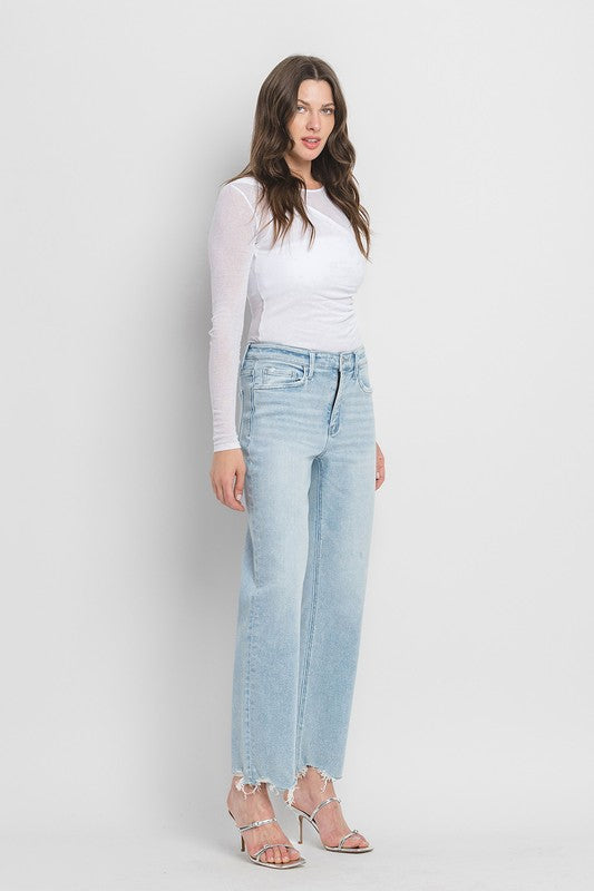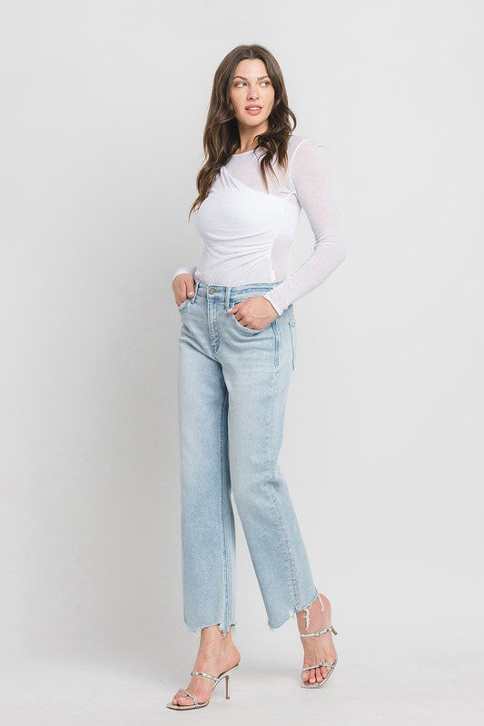 HIGH RISE SLIM WIDE JEAN. COMFORT STRETCH DENIM, RAW HEM, ANKLE LENGTH, SLIM WIDE JEANS