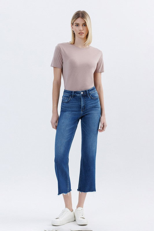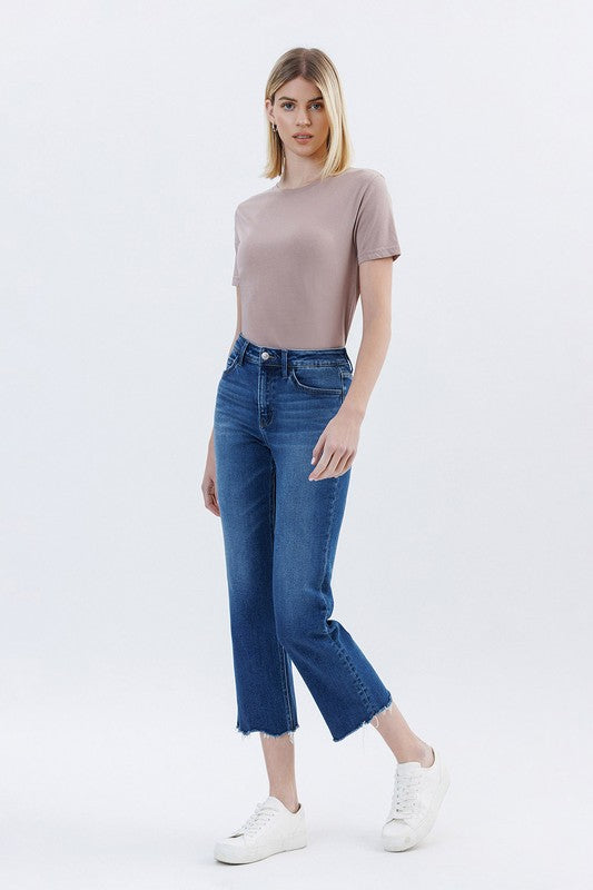 HIGH RISE UNEVEN RAW HEM ANKLE STRAIGHT JEANS
