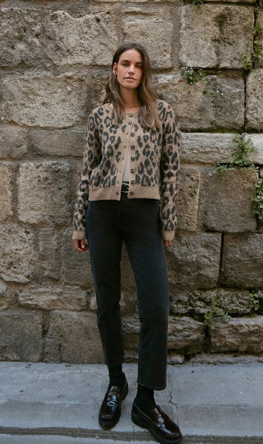 - An easy-fitting button-down cardigan made from midweight knit fabric with a classic animal print design.
